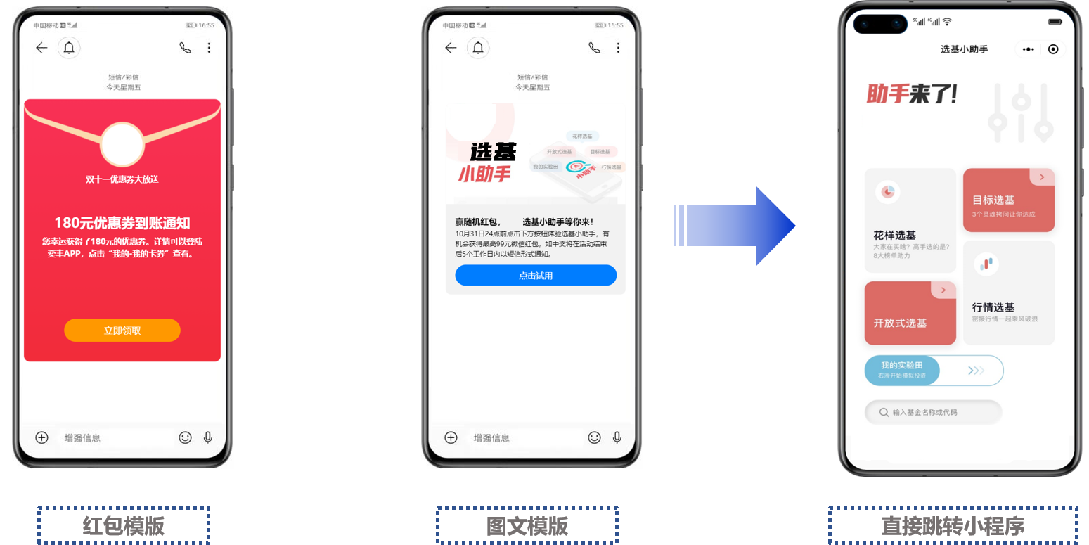 现在不管是APP还是小程序,拉新促活的成本都越来越高,尤其针对金融行业的用户运营来说,除了简单的引导用户下载APP,更重要是顺利获得运营手段激活用户,转化为有价值的用户。从这一点出发,PA真人视讯科技5G消息解决方案新增了多种样式的消息模板,支持采用图文+红包文案的方式助力基金行业高效拉新促活。