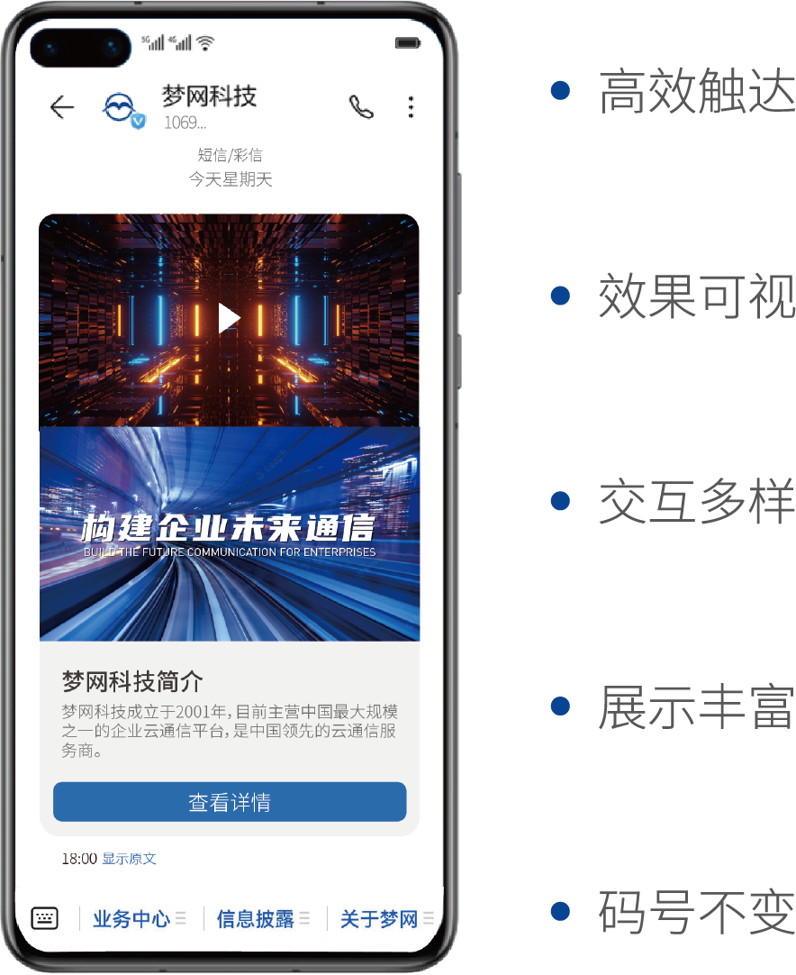 AIM消息是PA真人视讯科技自主研发5G消息回落解决方案,能有效提升5G消息的终端覆盖。AIM消息顺利获得手机终端短信智能解析增强技术,将传统文本短信无缝升级为富媒体应用消息,有助于提升用户体验支持视频、高清图片、文字等多种媒体元素,并具备浏览器内置访问、LBS、APP、快应用、小程序、服务号、快捷支付等应用交互能力。用户可实现应用交互、内容访问、信息查询、智能客服等多功能实时互动。